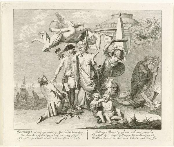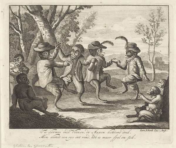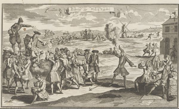 Editor: Here we have "Soldaat bespot door narren," or "Soldier Mocked by Fools," a print dating sometime between 1615 and 1709 by Nicolaes Lastman. It’s done as an engraving and is dominated by these caricatured figures surrounding what I presume is the soldier. I'm immediately struck by how unsettling the scene feels. What do you make of this scene? Curator: Well, it seems like we’re peering into a carnival mirror reflecting human folly. Lastman, though working in the Dutch Golden Age, also plays with Baroque sensibilities, highlighting drama through exaggeration. Do you see how each figure, with their elongated features and distorted expressions, seems to embody a particular type of foolishness? Their gestures are all amplified, bordering on the grotesque. It's like he’s asking us: Who is truly the fool here? Editor: So it’s almost a question of perspective? Like, the soldier may appear foolish in this context, but... Curator: Exactly! The text above, “Mundus vult decipi” - "The world wants to be deceived" - could suggest that everyone here plays a part in some form of deception. The ‘fools’ may just be showing the soldier and, maybe us too, a truth about vanity. Maybe we willingly play the fool to avoid harsher realities? Do you find yourself siding with anyone here? Editor: Not really. The soldier certainly doesn’t appear heroic, and the others… their grins are too wide. They make me uncomfortable! It almost seems to say something bleak about human nature. Curator: Perhaps Lastman's work pushes us to acknowledge those uncomfortable aspects, encouraging reflection on where we ourselves fall on the spectrum of foolery. The fact we are discussing it now shows the artwork really succeeded in triggering that reflection. Editor: It's definitely given me a lot to think about, and maybe to question who gets the last laugh.