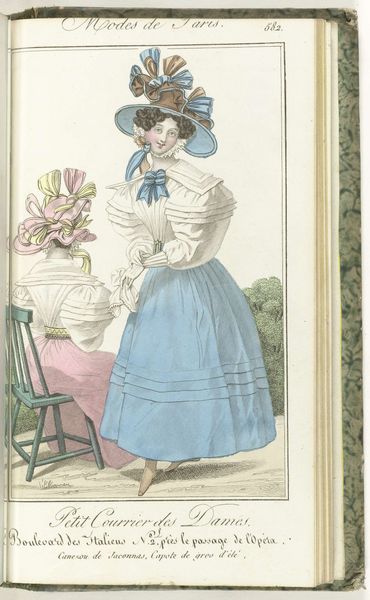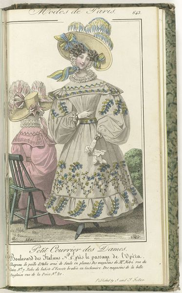 Curator: Let's take a look at this print titled *Petit Courrier des Dames, 20 mai 1829, No. 639 : Modes de Long-champs…*. It appears to be an illustration from 1829. The piece uses ink and watercolor on paper, currently held in the collection of the Rijksmuseum. Editor: My immediate impression is…delicate. There’s a softness to the colours, the way the watercolor washes across the paper. And so much detail— the lace, the embroidery. Curator: The print’s appearance coincides with the Romanticism movement and as such fits into a period when fashion plates served a crucial function, influencing not only the cut and fabric of clothing but also circulating aspirations around status and social identity, which served as early examples of commercial art in many respects. Editor: Definitely. And considering it’s for "ladies," one has to analyze this representation of gender. There’s this carefully constructed femininity on display, with those massive sleeves and delicate hats. One might argue whether it's representative of imposed norms or celebrating a powerful assertion of style in the 19th century. Curator: These images reinforced emerging social hierarchies. We can investigate the relationship between clothing, economics, and the way women maneuvered for agency in the late 1820s. Consider how the commercialisation of trends affected expectations within different classes, and whether publications actually fostered more creativity or instead homogenized dress among all who wanted to participate. Editor: This opens a very interesting field for discussing today’s "influencers," whose existence is tightly associated with commercial aesthetics. Even within supposedly individual creative spaces, we see the echo of the politics that existed 200 years ago! Curator: Precisely. Understanding these historic depictions offers vital clues for today's landscape. We should not interpret aesthetic illustrations such as these through modern sensibilities without understanding their socioeconomic and historical functions in European public life. Editor: The layers of analysis that emerge, even from seemingly simple images, speak to the significance of fashion in representing identity. It’s fascinating how visual codes remain!