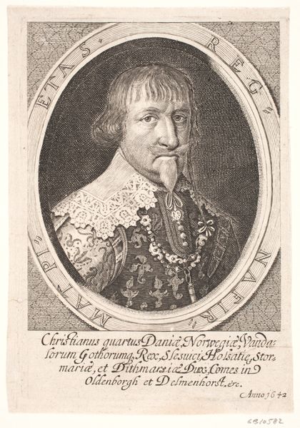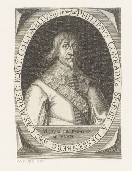 Editor: Today, we're looking at "Portret van François de Lorraine," a 1654 engraving by Jean Frosne. What strikes me is the incredible detail, particularly in the subject’s face and the surrounding text. It's almost overwhelming; I'm unsure where to focus my attention first. How do you interpret this work? Curator: This print is fascinating because it embodies the power of visual symbols to communicate status and authority. François de Lorraine isn’t just a man; he's carefully constructed as a figure of power. Look at the symbols embedded around him, framing his person. How do those surrounding emblems make you feel? Editor: A little lost, I guess. There's a cross, obviously religious symbolism, and other things I can't identify. Curator: Exactly. The cross indicates his high religious office, his regalia speaks to his nobility, and the Latin text celebrates his virtues and lineage, acting as a visual memory aid for his achievements. He would have wanted viewers to recall particular things about him and his family. What continuities do you see in our contemporary use of symbolic imagery? Editor: Well, companies use logos, and politicians use symbols like flags or colors to associate themselves with certain values or ideas. I suppose it's all about conveying a message quickly and effectively. Curator: Precisely. And even the artistic style, with its formality and intricate detail, reinforces the idea of order and hierarchy. It suggests an unchanging structure of society where François holds a distinct and ordained place. Editor: It’s interesting to think about how someone would have immediately understood all those visual cues at the time. It makes me consider the lifespan of images. Curator: And how meanings evolve across different eras, yet some needs stay surprisingly constant!