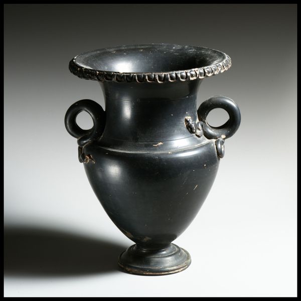 Curator: Let’s turn our attention to this terracotta oinochoe, or jug, created around 399 BC by the Group of Vienna O.565. It resides here at the Metropolitan Museum of Art. Editor: Oh, it's sleek! Like a shadow solidified into a vessel. I’m immediately struck by how the dark, polished surface gives it this wonderfully mysterious presence. Curator: Indeed. The oinochoe form was prevalent in ancient Greece for serving wine, and the material, terracotta, speaks to both accessibility and artistry in that period. Examining it now, we might think about who this vessel was intended for, what roles it may have played in symposia, and even how it may underscore the class and gender dynamics of ancient Athenian society. Editor: Class dynamics and a wine jug! I hadn’t considered it in that light. I am looking at the handle, you know. Its curvaceous design makes it both beautiful and quite functional. How deftly that loop sits just so on the lip for pouring! You know, you almost forget it's essentially glorified dirt. Curator: Precisely. And the dark sheen is significant. Think of the symbolic value associated with specific materials. The lustrous finish here implies wealth, maybe echoing the darker aesthetic trends which existed during the late fifth century BC that embraced funerary practices within Greek societies. Editor: The darkness adds gravitas, you are spot on. This almost Gothic romance the vase has, right? Like a piece that whispers of hidden chambers and perhaps some ancient libations. But it is more complex than I had first taken in. How a basic item can become not only timeless but quite emotionally present for us millennia on. Curator: Right. Beyond aesthetics and function, objects such as this can be a lens through which to view cultural values and sociopolitical undertones. And, thinking about the lack of figures here on its dark glaze, can invoke the rise of individuality and self-expression during classical antiquity, far different from other highly decorated works. Editor: This piece started as simple inspiration. I mean it's beautiful, don’t get me wrong. But hearing your breakdown, you’re dead on. It becomes less a container and more a fascinating bit of socioeconomic history to really mull over. It's rather amazing what art can whisper to us across the ages, really!