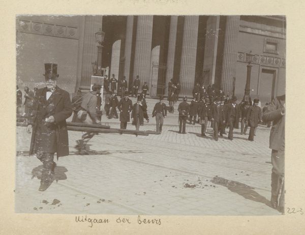 Hendrik Herman van den Berg captured this photograph, titled 'Bankiers of handelaars voor de Beurs van Zocher', at the Zocher Stock Exchange. This photograph gives us a glimpse into the social hierarchies of the late 19th and early 20th centuries. Men in suits and hats dominate the scene, embodying the era's prevailing image of power and commerce. The presence of a few women, often accompanied by children and sheltered by parasols, hints at the restricted roles assigned to them in public and economic life. Van den Berg does not seem to be challenging any traditional power structures in this photograph. The architecture of the Zocher Stock Exchange, with its imposing columns, symbolizes the might of financial institutions, while the cobblestone street suggests the everyday world upon which this power is built. The photograph serves as a lens through which we can examine the relationships between wealth, gender, and class in a rapidly changing society. It invites us to reflect on who had access to economic spaces and who was left standing outside.