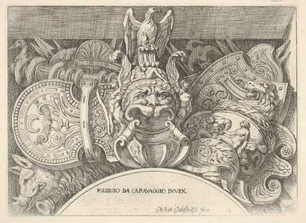 This ornamental frieze with a breastplate in the middle was made in the 16th century by an artist known only by the monogram MHF. The image combines naturalistic elements with elements of warfare and of craft. The combination of idealized forms and a display of armour reflects the cultural values of 16th century Europe. Images such as these played a role in shaping social status, cultural identity and expressing cultural power. Friese such as these, made by printmakers, would have been collected in albums and used by craftsmen as templates. This print belongs to a larger shift in the understanding of art production in which there was a movement away from the guilds and toward the academy. As art became increasingly associated with intellectual pursuits, the social status of the artist began to change. By studying the printmaking techniques, the historical context, and the artist's influences, we gain a deeper understanding of its meaning and significance.