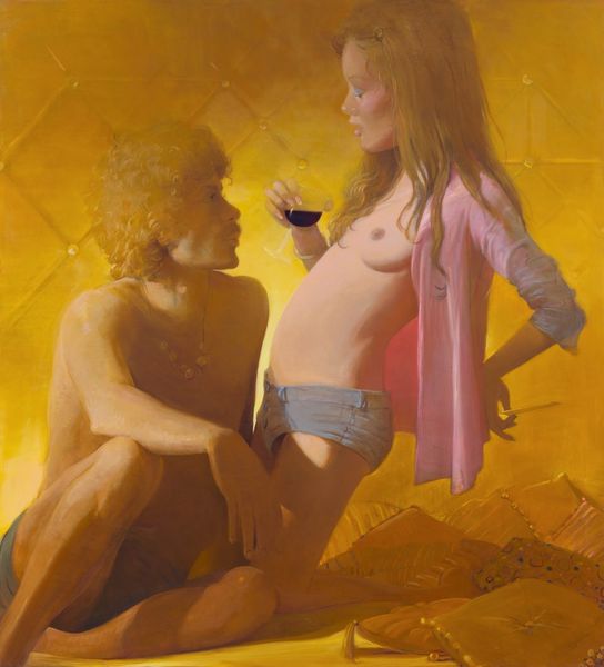 Curator: What a perfectly fraught tableau. This paperback cover, by Robert Maguire and titled "A Thorn in Paradise," presents a classic dilemma of romantic tension. Editor: Yes, immediately, one notices the cool tonality throughout the image punctuated only by the implied heat of the fireplace. There's a wonderful compositional dichotomy between the coolness and implied ardor. Curator: Absolutely. Maguire’s covers were ubiquitous, fueling the postwar hunger for escapism in domestic spaces that privileged the heterosexual romantic couple. He’s trading here in tropes both visually and narratively. Editor: True. Formally, the painting relies on conventional strategies—the subtle triangulation of their bodies, her rigid stance against his assumed power—but that's the point, isn't it? The semiotics of the image are instantly readable to its intended audience. Curator: And culturally coded. The floral arrangement in the background, for instance, might symbolize love and beauty, but it's also safely contained, a kind of domesticated wilderness mirroring her own circumscribed situation. Editor: Her slightly upturned gaze—a common feature in romantic painting across centuries. Note, however, the very defined outlining around her lips, creating an interesting contrast to her seemingly gentle vulnerability. What commentary do you believe this is offering about ideal femininity? Curator: It suggests artifice and possibly also rebellion. Maguire expertly navigates expectations. On one hand, these covers perpetuated fantasies. But, the novels within sometimes tackled themes considered progressive for their time. They were a battleground. Editor: It's interesting that these pocket books served that particular purpose for their female readership at the time. With these works so entrenched in pop culture, are we able to divorce them from the male gaze that may have influenced their narratives? Curator: That is precisely the complex critical challenge we must address! What do you make of that blue? Such an unrelenting wash! Editor: Precisely; it cools and colors everything around it. It speaks of hidden depths beneath her blonde façade. I leave with the notion that paperback art provides such richness for critical discourse!