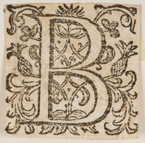 Editor: This is "Letter B," by an anonymous artist, at the Harvard Art Museums. It's a relief print, I think. The detail is amazing! How do you see this piece fitting into its historical context? Curator: Consider how prints like these, often found in early books, democratized art. Before mass production, intricate designs were only accessible to the elite. How does this accessibility shift our understanding of art's role in society? Editor: So, it's not just about the letter itself, but about making art available to more people? Curator: Exactly. The letter becomes a vehicle for broader social change, influencing literacy, education, and visual culture across different social classes. Editor: That's a totally different way to look at it! Thanks for sharing. Curator: My pleasure. It's fascinating to consider the political power embedded within seemingly simple images.