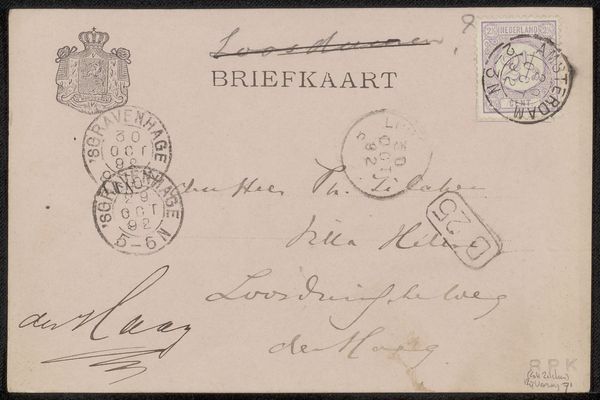 This Briefkaart aan Anna Dorothea Dirks was made by Richard Nicolaüs Roland Holst at an undetermined date. It looks like it’s made with ink on paper. What strikes me first is the way the stamps and handwriting mingle together, almost like a collage, like Roland Holst is interested in the way these various marks can sit together on the same surface. There is a real physical process going on here, with smudges and blurred edges, and the overlapping of ink and paper. Holst's background as a graphic designer and printmaker really shines here. This piece reminds me a little of Kurt Schwitters in how it finds artistry in the everyday. Both artists really play with the idea of finding art in the mundane, elevating things like postal ephemera to something more. This work isn't about grand statements; it's about the quiet beauty of connection, communication and the kind of exchange of ideas that makes art worthwhile.