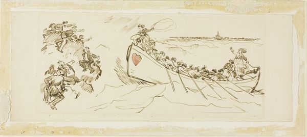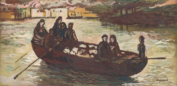 Curator: Looking at Justin McCarthy’s “Washington Crossing the Delaware,” now held at Harvard Art Museums, what strikes you first? Editor: The texture, definitely. The paint is so thickly applied, almost sculptural. I wonder about McCarthy's relationship to materiality. Curator: Indeed. McCarthy worked outside academic art circles, and his engagement with popular historical imagery like this reveals much about how national narratives were circulated and understood. Editor: Right, and the very act of painting such a well-known scene, the labor involved, makes us consider the social impact of this repeated imagery. Curator: I agree. The iconic status of Washington crossing the Delaware is really re-framed here; its visibility and historical placement is all the more prominent. Editor: It makes you wonder who is more important, the myth or the man. Curator: Precisely. And McCarthy's process really drives that home.
