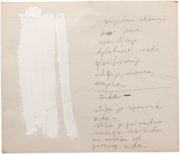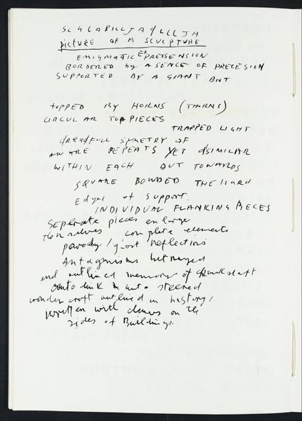 Editor: This work by Sir Eduardo Paolozzi is called “Split Phoenix.” It seems to be undated, and consists of handwritten text on paper. I’m struck by the raw, almost stream-of-consciousness feel of the writing. What do you make of it? Curator: Paolozzi's work frequently grapples with the intersection of technology, mass culture, and the human condition. Consider the title, "Split Phoenix," and the list-like text. Could this be a commentary on fragmented identity in the post-war industrial landscape? How might his interest in collage translate into this textual format? Editor: So, you’re saying the words themselves become fragments, like pieces of a larger, perhaps broken, whole? Curator: Precisely. Perhaps reflecting the societal anxieties of the time. It prompts us to question the role of the artist as a commentator on broader socio-political shifts. Editor: I never considered it that way. Thanks for the insight!