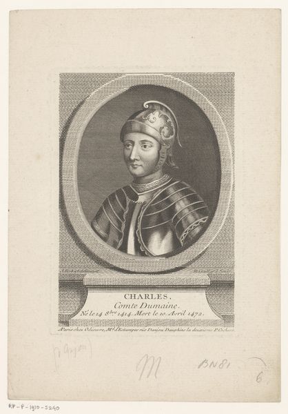 Curator: Let's consider this rather fetching engraved print. It’s a portrait of Charles de Valois, produced sometime between 1755 and 1765 by René Gaillard. It captures the subject, Charles de Valois, in profile, clad in full armor, a typical portrayal reflecting both status and historical context. Editor: Oh, interesting! I’m immediately drawn in by that helmet, so shiny. It looks like the engraver took great care to create these intricate details. Do you feel, like me, that it is strange he's got such soft facial features, like a baby's? Curator: Precisely! The tension between the softness you notice in his face and the hardened reality of the armor sparks a dialogue around power and representation, wouldn't you say? It makes you wonder about the socio-political layers beneath the surface of his aristocratic privilege. We also need to remember that this dates from an era in which Realism was combined with Baroque conventions. Editor: Maybe he was a softie, hidden beneath all that clanging metal. Imagine him giving battle commands and then stopping for afternoon tea and crumpets. Actually, scratch that; his story isn't a happy one since the engraving tells us he was Duc de Guyenne and that he died in 1472. Curator: A critical point. Death in 1472 positions him in a very turbulent period in French history, a nexus of feudal power struggles and burgeoning monarchical consolidation. This portrayal in armor symbolizes not just military readiness but also perhaps the anxieties of maintaining power. He died rather mysteriously... perhaps that’s an area worth researching further, eh? Editor: Oh, absolutely! Looking closer, the details really draw me in. I find it intriguing that even a simple engraving can evoke such a strong presence. I guess this also explains that slightly wistful gaze—anticipating an untimely demise! Curator: Absolutely. The material execution and contextual understanding offer a compelling look at art history as a deeply intertwined study of society and culture. Editor: For me, it’s all about the individual, even through all that armor—that's where art really connects.