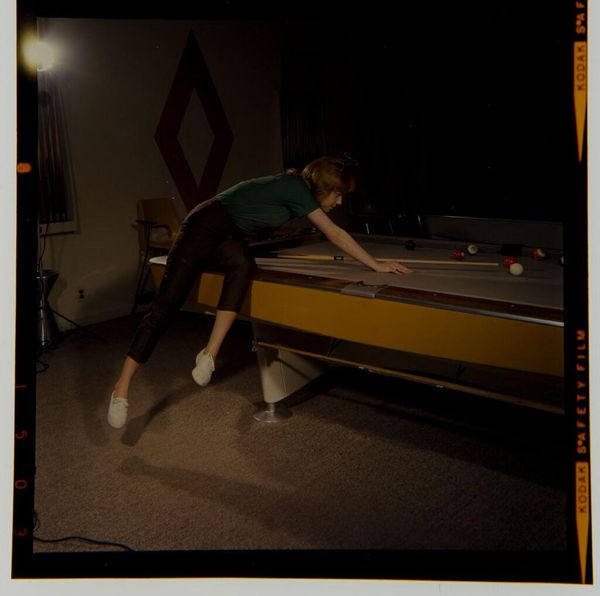 Curator: The intimacy here is striking. The composition, almost claustrophobic, pulls you right into this private moment. Editor: Exactly. What I notice first is the Kodachrome. This slide film yields an incredible saturation, but also grainy texture that’s characteristic of home snapshots. This photograph, of a woman playing pool, is by Jack Gould. Curator: There's a timeless quality to the scene, a snapshot of domesticity. The woman and child frozen in a tableau of leisure, the diamond patterns on the wall and pool table creating a symbolic space for play, chance, and even deception. Editor: True, but the act of shooting pool, as an activity, has always been class-specific. The way Gould frames it feels both intimate and staged. Curator: I find it speaks to the enduring role of women in the home, finding moments of joy and connection amidst the everyday. Editor: I agree, it’s a picture of play that speaks to social dynamics of labor. Curator: Seeing it this way has given me so much to consider. Editor: Me too, especially regarding the materiality of the medium itself.