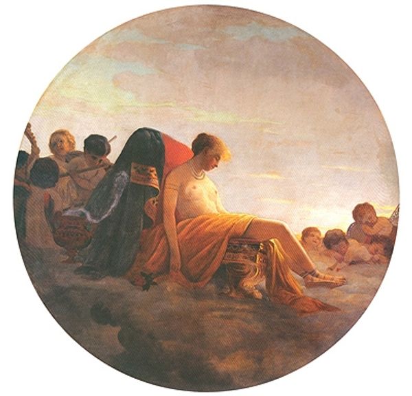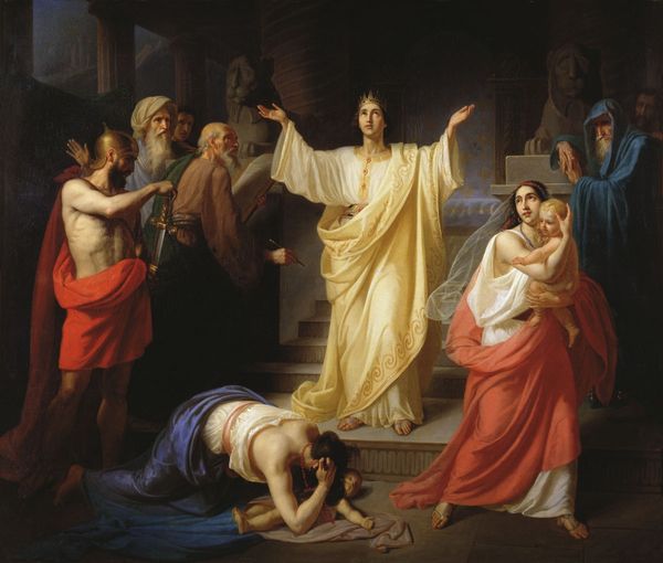 Curator: Bronnikov's 1869 canvas, “Pythagoreans celebrate sunrise," seems to glow, doesn’t it? A serene landscape frames a cluster of figures draped in white, posed in attitudes of worship. Editor: Indeed. The overwhelming whiteness is striking; it evokes ideas about purity, and of course, privilege. It feels very… staged. Were these Pythagorean philosophers truly a homogenous group? Or is this an idealised rendering through a specific 19th-century lens? Curator: The painting’s genesis lies in the late 19th century and the rise of positivism. There's a desire to depict historical narratives, yes, but it’s a selective rendering that also carries contemporary political implications. Bronnikov intended this as an allegory of spiritual awakening. Editor: Ah, yes, but what are the power dynamics here? Who gets to define "spiritual awakening?" Consider the very European features Bronnikov imbues to his subjects. It’s a construction. And the positioning of the central figure with outstretched arms—echoing Christ, almost—is quite telling. The image promotes the dominance of Westernized ideas. Curator: However, the appeal also lies in its accessibility. These paintings offered moral guidance that spoke to the educated middle class. You see the resurgence of interest in classical virtues against the backdrop of rapid industrial change. It's an imagined Golden Age. Editor: A “Golden Age” that excludes so much. If we consider the political milieu of Russia at that time, we must explore the issues that arise from portraying the “past” with such conviction—particularly who the artist includes in, or rather excludes from, this seemingly innocent dawn. What’s erased is as important as what’s rendered here. Curator: Certainly. But what endures for me is Bronnikov's skilled handling of light, capturing the tranquil anticipation of the sunrise, offering hope and reflection... Perhaps inviting the viewer to reconsider what constitutes virtue or spirituality today. Editor: Perhaps. But I urge us to confront whose narratives get legitimized through artworks like this. And in this instance, recognizing the absence of diversity is absolutely crucial for a modern viewing. Let’s not repeat history.