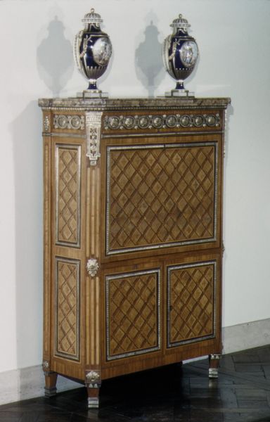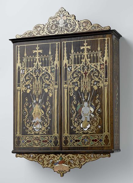 Editor: So, here we have a screen made around 1910 to 1930 by Chris Lebeau, entitled “Kamerscherm bestaande uit drie bladen waarop gestileerde pauwen,” quite a mouthful, I know. It’s a mixed-media piece featuring screenprint, and immediately it strikes me as elegant, almost theatrical. It feels like something you’d find in a bohemian's dressing room, full of secrets. What catches your eye in this artwork? Curator: Oh, this piece sings to my soul! It’s like gazing into a peacock’s dream. Those stylized peacocks...Lebeau wasn't just depicting birds; he was capturing the essence of Art Nouveau's embrace of nature and decorative art. Can you feel the lines? So fluid, yet contained, almost vibrating with the spirit of orientalism, don't you think? And what stories it could tell! It's a moment frozen in time, a whisper of a bygone era. Editor: Yes, I see what you mean. The lines definitely create a sense of flow, despite the rigid geometry. It's an interesting contrast. Do you think that the geometric elements are there to kinda of “corral” that wild spirit? Curator: Absolutely! The geometry anchors the piece, creating a sense of order. But, it's an order born from chaos. The peacocks, those flamboyant showstoppers, are tempered by the structure. Do you think Lebeau was exploring that push-and-pull of freedom and constraint in other areas of his life? One wonders, doesn’t one? I picture him pacing in his studio, agonizing about balance. Editor: That's a lovely image! Now I'm wondering if that central peacock looks almost symmetrical in its chaos... thanks to the frame. It almost has this quality about order coming from the outside. That feels pretty modern too, in a strange way. Curator: Ooh, I love that! Yes, there’s an inherent dichotomy. And look! That geometric pattern at the base...the repetition suggests boundaries…limits! A constant conversation between freedom and control. Art is just sophisticated gossip anyway. What is the "gossip" here, do you think? Editor: Well, now I see how those repeating forms are kind of limiting the design. It does change things seeing those tensions! Thanks for that different perspective. Curator: And thank you. I may just have to come back and sit with Lebeau for a little longer to try and catch the answer…