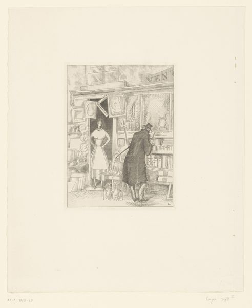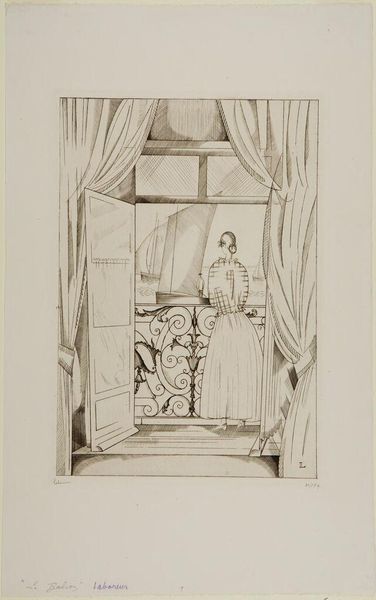 Editor: This is "Seascape through a window" by Jean Emile Laboureur, made in 1923. It's a drawing or etching, a pen illustration almost, and it feels incredibly intimate, like a stolen moment of contemplation. There’s a figure looking out at the sea...What jumps out at you? Curator: What grabs me is the sheer sense of quiet, you know? The woman, framed by the window, the delicate curtains… She's poised between interiority and the vast expanse of the sea. It's like she’s caught between her own thoughts and the beckoning of something larger. The art-deco touches in the ironwork suggest a certain stylishness, a particular moment in time, doesn’t it? Editor: It does! And the ship almost ghost-like out in the distance. Do you think it's symbolic, maybe representing a journey or an escape? Curator: Perhaps! Or it could be as simple as life carrying on beyond the confines of that room. I wonder what she’s thinking. Maybe of a love long lost at sea… What story do *you* think Laboureur is trying to tell? Editor: I hadn't thought of loss! It could be anticipation rather than just wistful longing, I suppose. The fact it's an etching... the detail is just phenomenal. You feel you could reach out and touch those curtains. Curator: Absolutely! And notice the interplay of light and shadow? Laboureur teases the eye with what is seen, and equally what is withheld. I adore the little "L" on the lower right, it's an affirmation that it is there... Editor: Yeah, I see it! This has totally shifted how I initially saw the piece; now it’s all stories within stories! Curator: Precisely! Isn't it wonderful how a seemingly simple scene can unlock such depths?