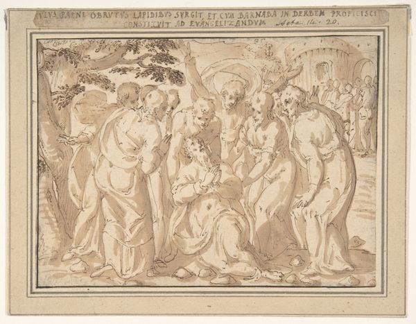 Curator: Immediately, the hatching grabs me; the cross-hatching technique used creates so much visual weight and dimensionality. It almost looks as if this "Sarcophagus," made anonymously, were pulled right out of Ovid. It certainly echoes the sort of epic tales of metamorphosis, perhaps dating as far back to the Renaissance period, between 1500 and 1600. Editor: Whoa, you went deep, fast! My initial gut reaction is simply playful chaos. Putti galore and river gods lounging, even a mysterious figure in the middle – they all come together to exude the kind of mythological joy you'd slap on your own sarcophagus to ensure a fun afterlife. The fluidity of etching almost feels like these figures are just *dreaming* the drama. Curator: Agreed, there is definitely playfulness interwoven. If we consider that etchings like this "Sarcophagus" served as templates—as accessible copies to be widely distributed—it suggests that artists wished to disseminate certain ideas about the Renaissance and Humanist thought. Gods were certainly trendy! Editor: Exactly, imagine artisans drawing inspo from prints like these. Suddenly, I’m getting a vision of how easily stories and mythologies become democratized. It’s like early meme culture, but for the elite artistic circles. Curator: Well, cultural memes or memory absolutely hinge on symbols that trigger recognition—symbols like a wreath or certain posture—and these would have triggered very specific interpretations about status and virtue. This sarcophagus illustration isn't merely decorative; it's instructive and very consciously places value on Greek mythology and Renaissance ideologies. Editor: Ah, that is very well said! Almost like the Ancient version of fan fiction constantly retold through drawing! Anyway, this trip back into illustrated sarcophagi has reminded me how our ancestors mixed storytelling and, dare I say, meme-making, a concept that echoes today's digital sharing. It's quite a reminder that death and stories, after all, bring life across millennia.