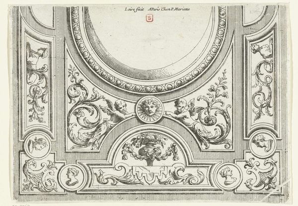 Curator: This is "Galeriae Farnesianae: wall decoration," an engraving by Pietro Aquila, dating back to the late 17th century. Editor: Wow, my first impression is just...weighty. There's so much detail, but it's all rendered in such a restrained, almost academic way. Curator: Absolutely. Aquila meticulously captures the ornate architectural details and classical figures that would have adorned the Farnese Gallery. It's a visual record, almost an inventory of its grandeur. Editor: The figure carrying another on his shoulder is striking, as is the heraldic shield. But it's the sheer density that gets me. Do you think it’s intended to overwhelm? Curator: Perhaps. Or to impress with the sophistication and cultivated taste of the Farnese family. Aquila's skill lies in translating that opulence into a black and white print, making it accessible, in a way. Editor: It’s like he distilled the very essence of Baroque excess. I can feel the artist’s hand in every line, even though it’s a reproductive print. It speaks to the enduring power of classical ideals, or at least the performance of them. Curator: Indeed. It reminds us that art, even when documenting other art, can be a potent expression in itself. Editor: I think it’s a stunning reminder that the past, like the present, is built upon layers of stories.