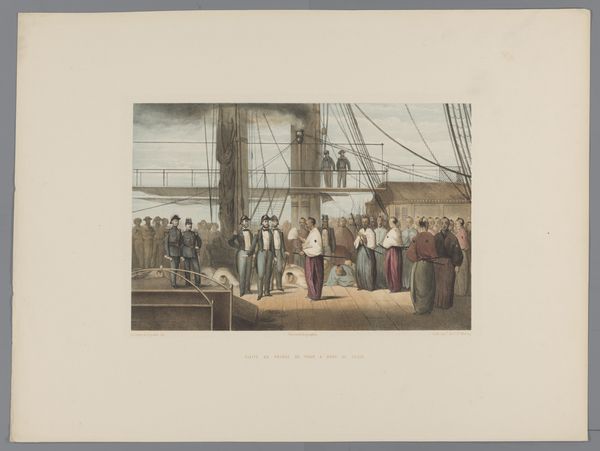 Editor: Here we have "Travellers on a Ship's Deck," made sometime between 1852 and 1863, potentially a photograph with applied watercolor or colored pencil. There's an almost staged feel, with everyone arranged so carefully. What do you make of the composition here? Curator: Indeed. Immediately, I observe the deliberate placement of figures. Consider the arrangement of lines; the masts rise vertically, contrasted by the implied horizontal line of the deck and sea. The artist utilizes a shallow depth of field, compressing the pictorial space. Notice how this flattening effect emphasizes the two-dimensional qualities of the image, shifting our focus to the interplay of shapes and colours rather than a realistic depiction. Editor: It’s almost like a frieze, everyone lined up. What about the colour? The pinks and blues stand out. Curator: Precisely! The palette is restrained, yet the calculated placement of these colours – the pink dress, the lavender parasol – guides the eye across the surface. Consider their semiotic function. Do these colours merely decorate, or do they hint at underlying structural relationships? Is there an inherent visual logic at play in how colour is employed to unify the various groupings? Editor: So you're suggesting it's less about 'who' they are and more about how the elements work together on a formal level? Curator: In part, yes. Disregarding any anecdotal context, our focus turns towards the underlying structures within the image itself. It beckons us to delve deeper into the compositional mechanisms and colour interrelations that the artwork employs to attain meaning. Editor: I’m starting to see how breaking it down this way helps reveal intention behind the piece. Thanks! Curator: My pleasure. Close, critical looking always offers a reward.