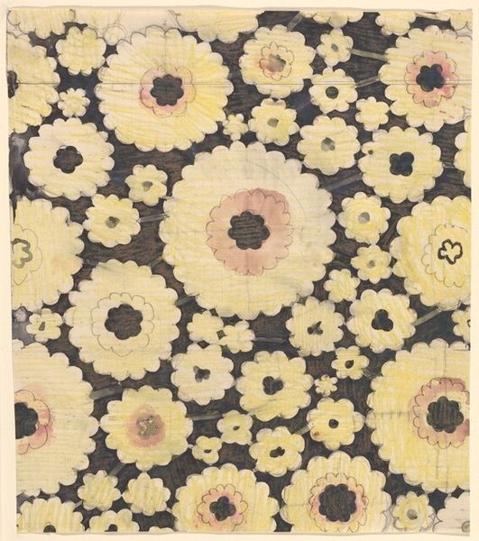 Curator: This is a fragment of textile art from around the 19th century, currently residing here at the Minneapolis Institute of Art. Its title is "Green-ground fragment decorated with floral arabesques and hollyhocks". Editor: Oh, I see why it’s called a "fragment"—it's a piece, just a glimpse. My first thought: botanical bedlam! It's got that vibrant, slightly chaotic energy of a flourishing garden, almost too much going on, but somehow harmonious. Curator: Absolutely. I'd say it pulls heavily from the decorative arts and what we might term Orientalism. What is particularly interesting here is how we can use postcolonial and feminist perspectives to unpack orientalist visual strategies in which the floral patterns have complex semiotic weight that references gender, cultural identity, and nature’s exploitation. Editor: I can definitely see the threads – literally and figuratively – of that kind of interpretation. To me it feels deeply rooted in the act of making, the almost obsessive detail speaking of time invested, perhaps by a woman in a domestic sphere. I get a sense of storytelling interwoven with the visual pattern. Curator: The swirling arabesques are very interesting. They draw from Islamic art’s complex mathematical patterns, often symbolizing infinite energy and the divine. The use of the color green, too, gains complexity when considered alongside similar instances throughout history, perhaps as a signal of ecological narratives or representations of Irish nationalism. The floral elements themselves were quite deliberate—think about floriography as a whole language. Editor: So it’s more than just pretty flowers, then! Thinking of its "fragment" status, I wonder what kind of lives the original textiles lived and how our interaction with a fragment affects our understanding of it, its context and the message that the original creator intended to send. Do we lose or do we perhaps create new, interpretive meaning with each isolated encounter? I am going to leave contemplating that now. Curator: An intriguing question. Thinking about it this way allows us to consider not only what's present on the textile but also what narratives are missing, altered, or suppressed due to its fragmented nature and colonial contextualization. Editor: A final thought? It’s like a secret garden caught on a piece of cloth. Makes me want to step into the wild abandon of it.