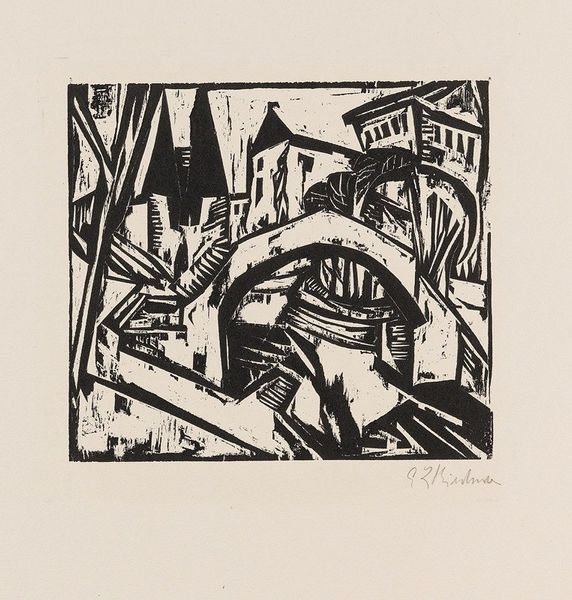 Curator: Peter Lanyon’s striking linocut, titled "The Returned Seaman", presents us with a powerful scene rendered in stark black and white. Editor: It certainly evokes a sense of stark homecoming. The high contrast creates a somber, almost mournful mood, doesn't it? Curator: Absolutely. Given Lanyon's deep connection to the Cornish landscape and maritime history, it's easy to see how the process of linocut—a rather humble medium—would lend itself to conveying the grit and raw emotionality of a seafarer's life. Editor: You can almost feel the weight of history and expectation on this figure. The composition is crammed with symbols—the horse, the buildings—situating the seaman within a specific cultural and geographical context. The return suggests a negotiation between personal identity and community belonging. Curator: I agree. The very act of carving, of removing material, mirrors the struggles and sacrifices inherent in that life. Editor: It definitely leaves you pondering the human cost of the sea and the complex narratives embedded in the land. Curator: Indeed, a powerful interplay of medium and message.