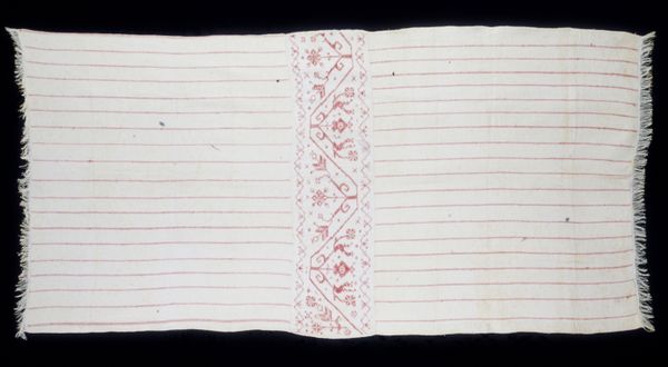 Editor: This is a towel from around the 19th century. It's at the Minneapolis Institute of Art and created by an anonymous artist. I see mixed media, weaving, textile, and fibre art. It looks pretty simple at first glance, just a piece of fabric with a patterned edge, but it has an intriguing aged quality. What are your thoughts on this humble textile? Curator: Oh, “humble” perhaps on the surface! But isn’t it interesting how something as everyday as a towel can become a little time capsule? Look closely – that border isn't just decoration; it's a whisper of a cultural language, wouldn’t you agree? Those repeating motifs…they’re less about individual creativity, and more about belonging to a community of makers. Each imperfection is the trace of the maker. Do you think its story is of utility, artistry, or something more complicated? Editor: That's a great way to think about it. I guess I was focusing too much on the wear and tear. The motifs almost look like simplified flowers or maybe stylized trees... It makes me think of the time and dedication it would have taken to create this by hand, the opposite of our mass-produced items today. Curator: Exactly! Now, imagine the hands that made this, the stories woven in along with the threads. Perhaps this was a wedding gift, or a christening token? The "decorative art" tag they have listed is cute and kind of misses the point. A domestic object holds all the potential intimacy that we associate with ‘high’ art. If the fibres could speak, imagine what secrets they would tell about a life lived! Editor: That makes so much sense. Seeing it just as a functional object, I completely missed the potential for it to be so personal and connected to someone's life. Curator: And that, my dear editor, is why art, in all its forms, keeps us eternally curious, eternally connecting with ghosts and the glimmer of our own experiences, too. We came in with preconceptions; we are leaving full of interesting feelings and more questions. Isn't that a win for a rainy afternoon?