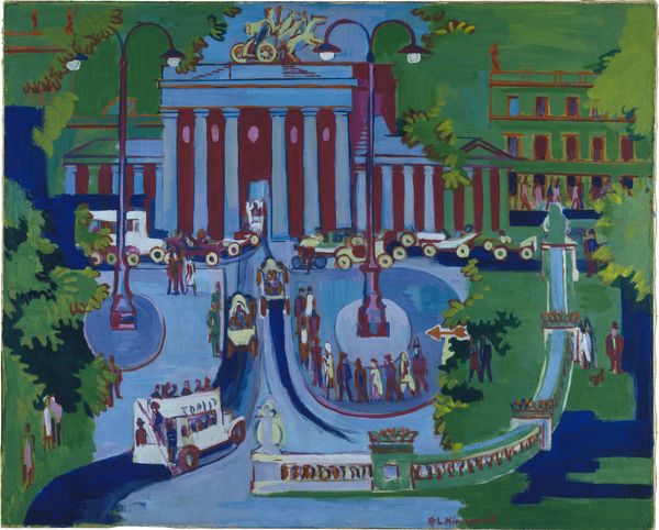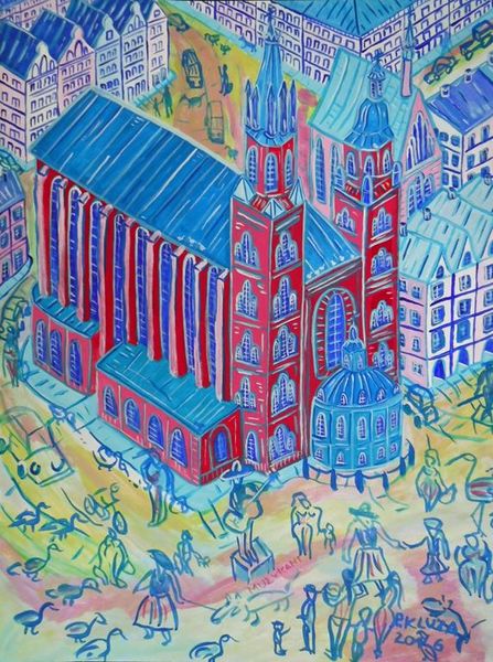 Editor: This is Pawel Kluza’s "Kościół św. Andrzeja," created in 2017. It seems to be an oil painting on canvas. I’m struck by how the rigid geometric forms of the architecture are softened by the vibrant, almost childlike color palette. It's very...playful. What do you see in this piece? Curator: Well, at first glance, the almost naive style combined with the title immediately conjures ideas about folk traditions and religious iconography intertwining within a modern context. The church, of course, has strong religious associations. But then, the figures almost appear to be shadow puppets and feel intentionally flattened. What feeling do you get from them? Editor: They feel detached somehow, like a stage play unfolding. Maybe they represent the disconnect between modern life and historical roots? Curator: Precisely. Consider how the birds and the dogs have wings: a kind of dream logic emerges that asks the viewer to interpret symbols not at face value, but by reflecting on cultural memory. Even the color palette is important. Does the bright palette invoke a sense of place for you? What kind? Editor: I see the bright colors of Krakow but then I start to imagine tourist souvenirs of Krakow. Curator: The work functions as both artifact and reflection on the tourist gaze; it suggests how cities are imagined, remembered, and commodified through image-making. Are we truly experiencing the ‘authentic’ Krakow, or a filtered and romanticized version sold in postcards? Editor: I see it differently now, less as a simple cityscape and more as a commentary on how we perceive cities through a cultural lens. Thanks for that, the city has changed for me! Curator: Absolutely. It highlights the continuous dialogue between tradition and modernity that shapes our experience. And now perhaps even your perception.