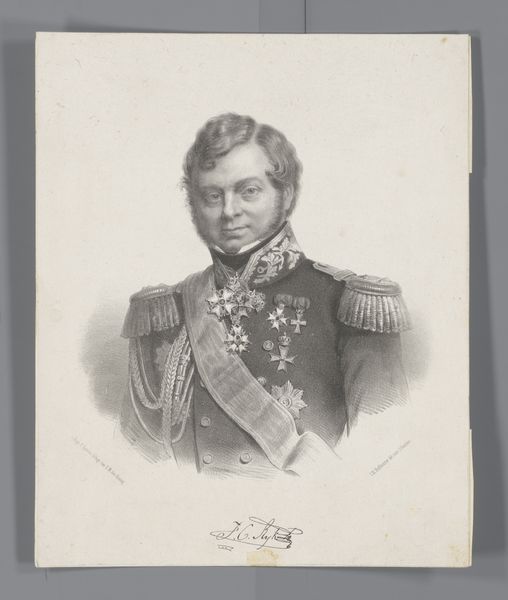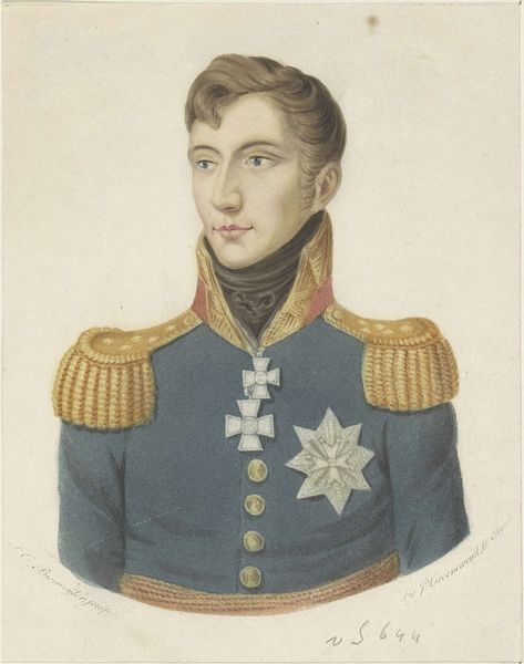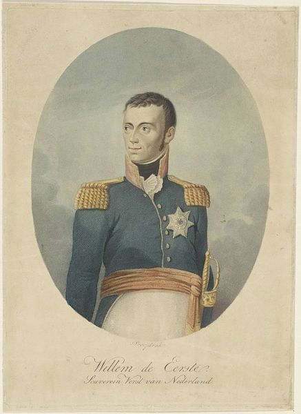 This is Willem van Senus's portrait of Willem I Frederik, King of the Netherlands, made with watercolour on paper. The portrait is contained within an oval frame, creating a formal and contained composition. Willem is depicted in his royal attire, a blue coat adorned with gold epaulettes and a prominent star. The symmetry of the composition, with the figure centered and framed, emphasizes the subject's status. The softness of the watercolor medium lends a delicate quality to the image, contrasting with the regality of the subject. The colour palette, dominated by blues and golds, reinforces this semiotic of power and authority. Yet, the softness of the execution perhaps challenges the very notion of fixed, unassailable power. The portrait can be seen not just as a representation of authority, but also an engagement with ideas of identity, representation, and cultural value. The formal qualities of the portrait, therefore, operate within a larger cultural and philosophical discourse, challenging us to continually re-interpret its meaning.