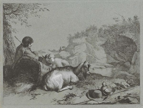 Editor: Here we have Frédéric Thódore Faber's etching, "Mededeelzame melkmeid," made in 1808. There's such a pastoral and serene atmosphere about it. What symbolic meanings might we find hidden within such a seemingly simple scene? Curator: Consider how milk itself functions as a primal symbol of nourishment, the maternal bond. Observe how it’s being directly shared here – not through a vessel, but offered almost ritualistically. Editor: That’s a good point. There’s something really intimate about how the mother is sharing the milk with her child directly. Curator: The directness speaks volumes, doesn't it? Faber evokes associations with classical allegories of charity and maternal care. Even the landscape seems to echo this abundance, acting almost as a guarantor of a safe world. Does that resonate with you? Editor: Definitely! There's something reassuring about the lushness of the scene. It’s more than just a genre painting, I think, because the setting feels like a supportive stage for the connection between mother and child. The placement of the sheep on the left of the landscape - is there more there? Curator: They symbolize innocence and pastoral harmony, alluding to older iconographies and the idyllic existence many yearned for during the social upheavals of the 19th century. And where is our point of view? Do you see the separation of worlds and inclusion? Editor: It's incredible how many layers of meaning you've drawn out from such a seemingly simple image! I hadn’t fully grasped the interplay between these symbols. Curator: Every detail, no matter how subtle, serves to deepen our understanding of Faber’s message and connects the present moment with archetypal themes that still hold emotional power today.