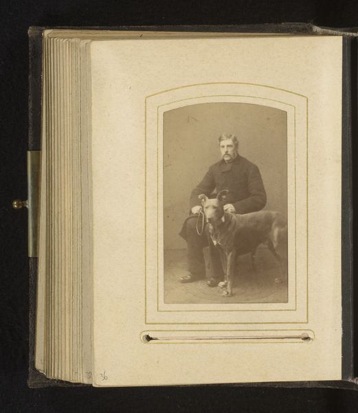 Editor: This is a daguerreotype called "Portret van een man met hond" by Wegner & Mottu, created sometime between 1860 and 1880. It’s housed at the Rijksmuseum. The photographic process gives it such a distinctive look, almost otherworldly, and the texture is quite striking. How do you interpret the composition? Curator: Formally, one notices first the striking contrast created by the arrangement of light and dark, especially focusing on the dog's fur, a soft darkness opposing the linear chairback that supports the gentlemen’s arms. What is its semiotic function? It contains the light from passing past his forearms, through the negative space of his ring and up through the neutral backdrop. Note also how the subject’s direct gaze commands our attention; it anchors the entire work. Editor: So, it's almost like the artist is setting up these lines and values to pull us into the image through a kind of contrast and tension, drawing the eye up into the ring? Curator: Precisely. The balance of tonal value across the field leads us toward its meaning. The photographer clearly intended to make effective use of tonal scales, which we should assume are arranged deliberately. Editor: I see what you mean. So much meaning comes from the relationships between these structural components rather than any contextual information? Curator: Yes, though any competent analysis takes all inputs into account. Ultimately, the interplay of forms and values constructs the primary language of understanding. Consider how this knowledge helps guide our analysis of artworks encountered in the future. Editor: Right, understanding that underlying structure gives us a new way of seeing. Thanks.