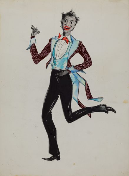 Editor: This is George File’s drawing, "Puppet," likely made between 1935 and 1942. The character looks so theatrical, like he’s frozen mid-performance. How would you interpret this work, thinking about the era in which it was created? Curator: Well, seeing this caricature of a performer during the late 1930s, I can’t help but consider the rising tide of political satire and social commentary in art during that period. The puppet motif is interesting here, particularly its connotations with control. Does the figure's exaggerated look suggest File's commentary on power or social class? Who is controlling the strings, and what commentary might that represent? Editor: That’s a great question! The puppet imagery definitely makes me think about manipulation, maybe reflecting anxieties around propaganda or authoritarianism that were brewing then. Curator: Precisely! And consider the institutional context – where might this image have been displayed, and who was its intended audience? Was it designed to elicit a specific emotional response, like humor, fear, or perhaps critical self-reflection within a certain social circle? How do we perceive caricatures differently today, with evolving views on representation? Editor: I didn’t think about where it would be shown; it adds another layer of political message. It makes you wonder if the strings represent the establishment and not a puppet master in a theater. This caricature probably looked very different when viewed eighty years ago! Thank you! Curator: Absolutely. Thinking about reception, social context and its visual composition changes how one might appreciate this interesting period work.