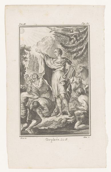 Editor: Here we have "Vignette," a print by Augustin de Saint-Aubin, from 1766, depicting Diana turning Actaeon into a stag. It has such an ornate, almost theatrical feel, with all the figures arranged so deliberately within that frame. What stands out to you about this piece? Curator: The immediate element that captures my attention is the intricate interplay of line and form. Note how Saint-Aubin utilizes engraving to create a sense of depth, with meticulously rendered details, juxtaposing light and shadow to give volume to the figures and the surrounding landscape. Observe how the artist manipulates line to delineate form, constructing the human figures. Editor: Yes, it is almost hyper-realistic, even in the fantastic setting of the Metamorphoses. What else are you seeing? Curator: Delving deeper, consider the formal balance. The artist structures the composition employing a pyramidal arrangement, from lower left to Diana at the composition's peak. Observe, also, the frame around the vignette. Ask yourself, does it serve a mere decorative function or does it reinforce, through its visual language, the themes present within the central image? Editor: That is an interesting point, considering the transformation depicted. Maybe the border is trying to contain the moment? Thank you for sharing! Curator: Of course. Recognizing these elements grants us access to a richer understanding, one where technique and symbolism intersect to deepen our engagement with the work of art.