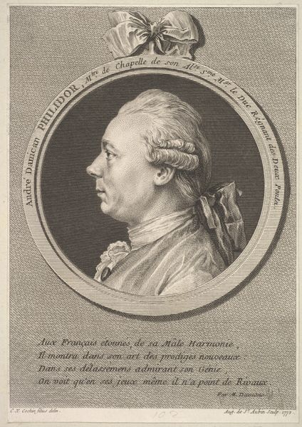 Editor: Here we have Augustin de Saint-Aubin's "Portrait of Jean-Baptiste Pigalle," created in 1782 using engraving. It's striking how this print captures so much detail, almost like a photograph, but of course it's a print! What draws your eye to this work? Curator: I’m immediately struck by how Saint-Aubin uses established visual languages to signal Pigalle's status. Notice the oval frame, almost like a classical cameo. How does that form echo other power symbols in the piece, can you think? Editor: Well, the ribbon at the top feels pretty important... Almost like an award. Is that a conscious decision? Curator: Exactly! Ribbons, medals, and frames of honor, those things carry weight. Think about how portraits function in cultural memory. They solidify status, preserve lineage, and subtly signal who matters and what values we should remember. Editor: So it’s not just about capturing Pigalle's likeness? The print almost seems to "crown" him with symbols. Curator: Precisely. Even the clean, precise lines speak to the Neoclassical values of order and reason. The engraving itself reinforces a message about control and craft. Consider how this kind of portrait was used to construct a historical narrative. How did the image function culturally and socially at that time? Editor: It seems designed to instill respect. Looking closer, the background is so textured, providing great contrast for Pigalle's profile, almost placing him on a pedestal. Curator: A fitting way to solidify his presence and achievements in our visual memory! The frame itself and use of text create a plinth on which Pigalle stands, so to speak, even after his death. Editor: I never thought about how something as simple as a portrait could communicate so much more than just appearance. Curator: And that is why symbols and their arrangements carry significance through history and continue to shape the way we remember our past.