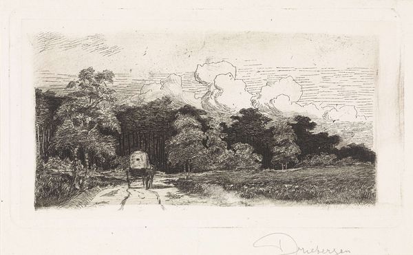 Curator: Elias Stark created this etching, "Huifkar op een weg te Driebergen" – which translates to "Covered Wagon on a Road in Driebergen"—possibly around 1887. It's currently held in the Rijksmuseum. What are your initial thoughts? Editor: It feels melancholic, doesn't it? The stark contrasts, the solitary wagon…it evokes a sense of quiet isolation. There’s a distinct absence, almost like the afterimage of a story that’s already unfolded. Curator: Stark captures that feeling through the masterful use of light and shadow. The wagon, receding into the distance, can also symbolize a turning away from the industrialized city towards nature. We see such motifs appear often when the populace fears modernity. Editor: I appreciate the suggestion of retreat. It brings up a critical question: for whom was this imagined rural simplicity accessible? The "covered wagon" wasn’t just a means of transport, it speaks volumes about class and opportunity. For marginalized groups, particularly those displaced by urbanization, this kind of retreat was more dream than reality. Curator: Indeed. It is important to keep in mind that while ostensibly apolitical, landscape scenes always serve some specific ideological purpose. Think, for example, of the enduring motif of "the road". Stark renders it particularly rough here, which speaks to the limits of travel. Editor: That reminds me how visual culture plays a role in constructing social hierarchies. Who gets to travel comfortably? Whose journeys are memorialized? There’s also a distinct romanticizing effect—the soft pencil shading suggests the peacefulness of rural life, which is often at odds with the very difficult agrarian reality. Curator: Absolutely. The artist has transformed pencil markings into a form of personal visual storytelling. If we compare it to contemporary landscape depictions, we note the absence of peasants or rural laborers toiling in the fields. Perhaps that choice is to present a specific idyllic view of the past? Editor: A constructed vision, no doubt. The imagery invites a contemplation of belonging and exclusion, and it provokes urgent considerations of progress and power. Art like this is never truly innocent; it reflects, reinforces, and sometimes resists dominant narratives. Curator: I hadn't thought of the wagon as necessarily moving away, but simply enduring, a permanent fixture along the country roads. Thank you for enriching the experience of witnessing it through these important sociohistorical lenses. Editor: And thank you for illuminating the symbols embedded within. It truly brings home how essential interdisciplinary understanding is to engaging with historical artworks responsibly.
