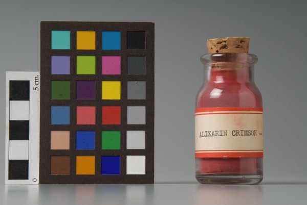 Curator: This is Cyanine Blue, a manufactured pigment by Charles Roberson and Co., residing here at the Harvard Art Museums. The color itself is striking. Editor: The bottle, the color chart... it feels like a relic of a painter's studio, promising vibrant hues, almost a visual spell. Curator: Indeed. Blue, throughout history, has held significant cultural weight, often associated with royalty, spirituality, and the unattainable. Editor: And think of the labor involved, from raw materials to its formulation, the journey of this pigment is a story of resourcefulness and trade. Curator: The color evokes a dream-like calmness, a tranquil escape, a visual representation of longing, perhaps? Editor: I am drawn to the small scale. This tiny jar represents a whole world of artistic potential, but also the economic structure that sustains the production of pigment. Curator: A fascinating intersection of science, art, and culture. Editor: Exactly. A potent reminder of the material underpinnings of creative expression.