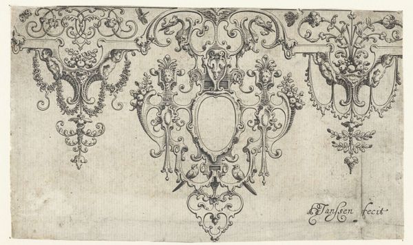 This is an anonymous print at the Rijksmuseum which presents a symmetrical array of shapes and figures, creating a visually engaging composition. The intricate linework defines the forms, from the delicate floral arrangements to the grotesque monster head, all balanced within a structured framework. The composition plays with the semiotic dance between good and evil, juxtaposing an innocent angel with a monstrous head. The visual symmetry suggests a deeper structural interplay between these opposing elements, hinting at a dialectical relationship rather than a simple binary. The artist employs a visual language that invites interpretation of the underlying tensions. Ultimately, the print destabilizes fixed meanings through its formal structure. The carefully balanced composition, full of intricate details, serves not only an aesthetic purpose but also a conceptual one, inviting the viewer to question and reinterpret the symbolic interplay.