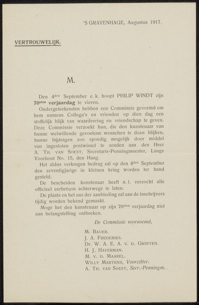 This is a letter titled "Brief aan Pieter Haverkorn van Rijsewijk," by J. Dijk. This letter commemorates the 70th birthday of the artist Colenbrander. The author reflects on Colenbrander's unique artistic path, noting his preference for solitude and avoidance of the mainstream art world. Dijk celebrates Colenbrander's distinctive and versatile artistry, particularly his work with the Rozenburg factory and his innovative carpet designs. The letter touches on the theme of artistic recognition, suggesting that Colenbrander's art was ahead of its time, leading to delayed appreciation. But now he is generally appreciated, because his art has a future, because it comes forth from genius. Dijk’s letter invites us to consider the complex relationship between artistic genius, societal acceptance, and the artist's own positioning within the cultural landscape, reflecting on the personal and emotional dimensions of artistic creation and recognition.