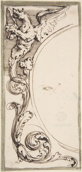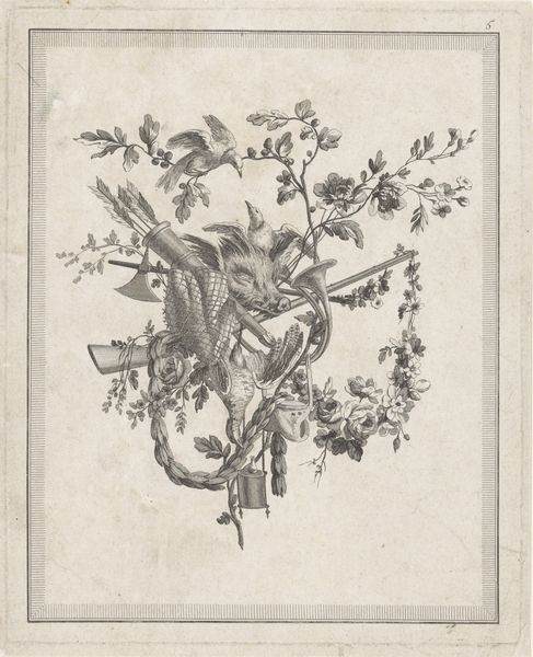 Curator: This print, titled "Trofee met wapens," was created in 1768 by Marie Thérèse Martinet and rendered through engraving. It’s quite evocative, wouldn't you agree? Editor: It does have a rather unsettling juxtaposition of cherubic playfulness at the top and instruments of war right below it. Like sweetness draped over steel. Curator: Exactly! Martinet’s masterful engraving brings out the details in a seemingly casual Rococo style, but the imagery itself seems… calculated. Below that adorable pair, we see weapons, banners, and all the symbols of military power bundled together. Editor: There's something ironic about celebrating instruments of war under the guise of innocent cherubs. One can almost detect a subversive comment about the period's glamorization of conflict and power dynamics, all carefully packaged, of course. Curator: The artist does seem conscious of her position. Considering Martinet’s broader artistic contributions—illustrating works on natural history, for example—could this be interpreted as commentary? Perhaps showcasing the absurdity of human conflict within the larger framework of nature and the animal world? Editor: Absolutely. Framing warfare in a seemingly decorative piece makes the celebration of violence appear almost farcical, perhaps criticizing its normalization in the society of the time. Curator: What I also find captivating is the piece’s subtle tension. It manages to blend seemingly disparate elements—playfulness and military might— into a strange harmony that hints at larger socio-political questions of the time. Editor: Right. It's not merely a display of skill but rather a silent provocation, which prompts viewers to look beyond face value into the deeper societal layers beneath such decorations. I can also perceive its value as a critique, almost ahead of its time. Curator: So, where do we land then? A celebration or subtle indictment? Editor: Possibly both, which renders Martinet’s work intensely complex. And utterly of its moment. Curator: Indeed. It challenges us to think— to truly engage—with art beyond mere aesthetics. A powerful demonstration of art as a tool of historical reflection.