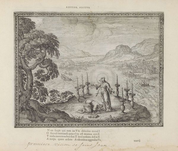 Pieter van der Borcht created this print, titled 'Vier uitersten', sometime between 1545 and 1608. It's an engraving that visualizes a prophecy, blending celestial events with earthly scenes of both teaching and turmoil. The image is divided, one side reflecting spiritual enlightenment, the other, societal upheaval. This division speaks to the dual existence of the self in the world. During van der Borcht's time, the anxieties of religious conflict were palpable, especially in the Netherlands. You see this anxiety materialize in the chaos depicted on the right, perhaps mirroring the tensions of the Reformation. Consider how van der Borcht uses light and shadow, 'Lux inter Tenebras', to guide your eye and your emotional response. The contrast isn't just visual; it's a commentary on the precarious balance between faith and the tribulations of earthly life, a balance that continues to resonate.