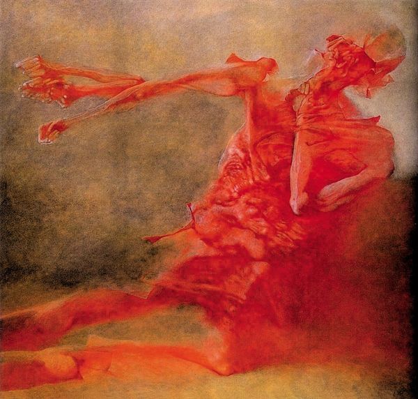 Editor: This is an "Untitled" piece by Zdzislaw Beksinski, and it looks like it's oil on canvas – although it is being referred to as matter painting – but correct me if I'm wrong! The…texture is so striking. There’s something incredibly visceral and unsettling about the figure. It’s almost repulsive, yet I'm drawn to it. How do you interpret this work? Curator: Ah, Beksinski. Yes, matter painting certainly seems fitting; it's as if he sculpted this figure from some unknown substance, pulling nightmares into existence. What I see, beyond the immediately disturbing imagery, is a profound meditation on mortality, wouldn't you agree? He offers us no comfort, no beauty in the conventional sense, only the stark reality of decay. He peels back the layers, challenges us to confront what we usually try to hide. Look at the sky, and what does that call to mind? Editor: That’s a fascinating idea. The way you describe him "peeling back layers" gives such a unique lens to understand this piece. I’m also noticing the strange juxtaposition of colors, almost sepia and that single spot of crimson above the body which… yeah, actually makes me think of an ominous sky, almost as if the figure’s being consumed by its atmosphere, by the heavens perhaps? Curator: Exactly! And perhaps a perverse heaven, one born of our deepest anxieties. Beksinski never titled his works, leaving them open to individual interpretation, which is an invitation. Don’t you find the absence of a title liberating? Editor: I never really considered the liberation aspect. You've given me so much food for thought on the artist’s choices and their potential deeper meanings. Curator: It is a delight. His art refuses to coddle; instead, it sparks within us our own individual response. It becomes a mirror.