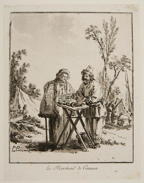 Editor: So, this is Salvator Rosa's "Other Figures of Men," housed at the Harvard Art Museums. It's a black and white print, and I'm struck by the figures' intense expressions. What can you tell me about this piece? Curator: Rosa was fascinated with the fringes of society. This print, like many of his works, depicts ordinary people—perhaps bandits or philosophers—outside the sphere of traditional aristocratic patronage. Consider how this imagery challenged the prevailing art market. Editor: Challenged it how? Curator: By depicting figures outside the traditional norms celebrated in academic art, Rosa offered a different vision, perhaps appealing to a broader audience or even critiquing the elitism of the art world. What do you make of the theatrical gesture of the central figure? Editor: It makes me wonder if he’s trying to captivate us, the viewers, along with the others in the image. I see how this piece makes one think about the role art plays in depicting and shaping social perceptions. Curator: Exactly. Rosa’s work is a fascinating lens through which to examine the social function of art.