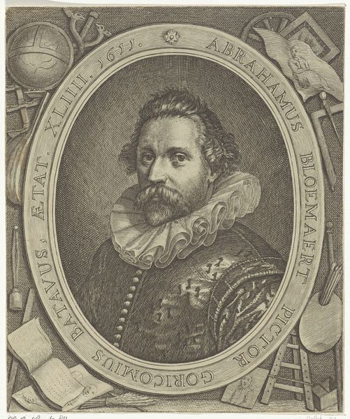 Editor: Here we have Willem van Swanenburg's "Portret van Abraham Bloemaert," an engraving from 1611. The detail is astonishing, especially in the ruff. The gentleman's gaze seems quite direct. What draws your attention in this piece? Curator: The symbolic weight of such a portrait, an engraving, lies not just in its detail, but its purpose. Consider the ruff, a perfect circle framing the face, a sun-like emblem of status and intellect. Think of its cultural connotations, how it signified prosperity. Editor: So, it's a marker of status? Curator: Precisely. But even more, in rendering Bloemaert as an engraving, Swanenburg participates in the act of canonization. Engravings allowed for reproduction and widespread distribution. He isn’t just depicting a man, but creating an *icon,* solidifying his place within the artistic memory of the Dutch Republic. Consider also the use of Latin – ‘pictor’. Editor: So the text surrounding the image also has symbolic weight? Curator: Undeniably! It’s a declaration, imbuing Bloemaert with an aura of timeless artistic value. Note the year 1611, appearing almost like a halo over Bloemaert's head. The visual language positions him within a specific historical and intellectual framework. Editor: I hadn’t considered the inscription that way. Curator: It encourages us to decode not only what we see, but also the symbolic program the artist constructs to shape how posterity would remember the subject. In this case, a celebration and remembrance of Bloemaert’s artistic status. Editor: I’ll never look at a Baroque portrait the same way again. Curator: And that's the magic of art – to see history, culture, and psychology embedded within the image.