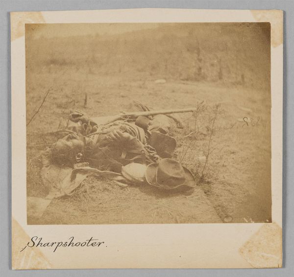 Editor: Okay, next up is "Confederate Soldier [on the Battlefield at Antietam]", a gelatin-silver print by Alexander Gardner from 1862. It's a stark depiction of a fallen soldier. It evokes such a profound sense of loss. What are your initial thoughts when you look at this photograph? Curator: Gardner's photograph operates on several levels. On one hand, it's a stark document of a specific historical event: the Battle of Antietam, one of the bloodiest single-day engagements of the Civil War. More broadly, however, it signifies a critical shift in how war was perceived and represented. Photography brought the brutal reality of conflict directly to the public, challenging idealized notions of heroism and valor. Editor: So it's challenging pre-conceived ideas? Curator: Precisely. Before photography, war was primarily depicted through paintings and drawings, often glorifying battle and focusing on triumphant leaders. Gardner's photograph, with its unflinching portrayal of death on the battlefield, stripped away that romanticism. It was exhibited in Mathew Brady's New York gallery soon after the battle, shocking viewers with its immediacy. Editor: That’s incredibly powerful. How did the public respond to such a stark image? Curator: With a mix of fascination and revulsion. While the photograph generated considerable public interest, it also provoked discomfort. It forced people to confront the human cost of war in a way they hadn't before, contributing to growing anti-war sentiment and changing attitudes about the conflict's purpose. Editor: It makes you think about the role of art in shaping public opinion and social change. Curator: Absolutely. Gardner's image highlights the power of photography to disrupt established narratives, influence social consciousness, and promote dialogue. And, perhaps more importantly, it immortalizes a soldier who would otherwise have been another statistic in this bloody and protracted battle. Editor: That is definitely food for thought. This conversation has deepened my understanding of photography’s early power. Curator: Mine too. It's a poignant reminder of art's enduring ability to bear witness and challenge prevailing attitudes.