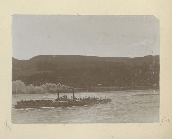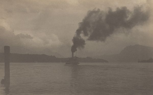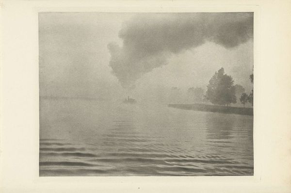 Editor: This is "Lake Lucerne," a gelatin-silver print by Alfred Stieglitz, possibly from the mid-1890s. The scene feels quite serene, despite the presence of what looks like a steamship billowing smoke in the distance. There's a real sense of stillness in the water. What draws your attention in this piece? Curator: That sense of stillness is deceptive, isn't it? What Stieglitz captures here is not just a landscape, but a moment in time where the industrial revolution, represented by that steamboat’s smoke, is actively reshaping the natural world. How do you think that tension plays out, not just visually, but considering the broader social and environmental anxieties of the late 19th century? Editor: So, it’s about more than just aesthetics; it’s a commentary on the changing landscape. The small rowboat in the foreground seems almost dwarfed by the industrial presence. Curator: Exactly. Consider the pictorialist movement Stieglitz was part of, and its complex relationship with modernity. He wasn’t simply documenting; he was actively constructing a narrative. The softness of the image, achieved through the gelatin-silver process, romanticizes the scene even as it acknowledges the encroachment of industry. Is he lamenting a loss, or perhaps hinting at a future, or even a forced co-existence? What perspective do you think Stieglitz has through the framing? Editor: I guess it's both, a bit of mourning for what's being lost, but also a recognition that this new industrial era is here to stay, that perhaps romanticizing nature and progress is a method of acceptance. Curator: And in whose name are we mourning, and whose progress are we measuring? Whose landscape is being reshaped, and who has agency in its remaking? We must never take photographs as evidence, but rather a testimony from a subjective narrator. Editor: That really changes how I see it. I initially just saw a pretty picture, but now it's a document filled with contradictions, anxieties and potential commentary about power. Curator: Precisely! It's in these nuances that we can unlock deeper understandings of not only the artwork itself, but the era that shaped its creation, and in turn how photography was already, at the time, complicit with progress narratives. Editor: This conversation made me realise that sometimes the most powerful statements are found in what seems the quietest of images. Curator: Indeed, and how the act of looking itself is never passive, but is an engagement with cultural and historical forces.