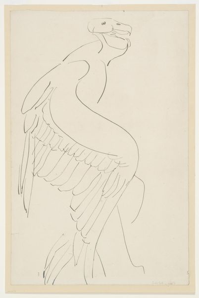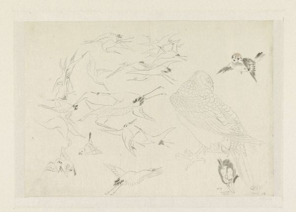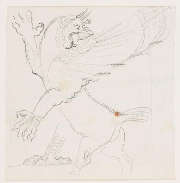 Curator: Let's discuss this pencil drawing, dating from around 1890 to 1900, titled "Roofvogel op een tak." It depicts a bird of prey perched on a branch. Editor: It’s striking. The use of simple lines gives the drawing a sense of raw, untamed power, like the bird itself. There’s also something almost vulnerable in the thinness of the lines, like the creature’s balance on the edge of things. Curator: Indeed. Birds, especially raptors, often embody complex symbolic weight. Throughout various cultures, they can signify freedom, foresight, or even aggression, acting as omens or spiritual messengers. How does this bird sit within those legacies, do you think? Editor: Well, the downturned head and piercing eye suggests vigilance. There's an element of hunting here. It's like this bird is observing the landscape, the artist observing the bird, and us observing both, implicated in an unending hierarchy. Considering its probable origins in the late 19th century, I’d say it's entangled in the politics of colonial dominance—the bird a predatory extension of a specific power dynamic. Curator: I hadn't considered that, but that perspective definitely aligns with its context. Interestingly, I find the lack of detail in the plumage quite evocative. Instead of precisely defining the species, the artist has distilled it into a symbol, rendering the essential characteristics. Editor: Yes, and perhaps even gesturing to what remains unsaid about nature. There's a whole visual history concerning landscape art and ownership implied through documentation like this one. Is there anything known about the social position of the artist in relation to the patron? Curator: It's part of Karel de Nerée tot Babberich's body of work. So we know it belongs to an aristocratic lineage. We are clearly talking about landscape from a specific vantage point. Editor: Absolutely, making its predatory theme perhaps unconsciously embedded, something he saw reflected in his social position. Curator: A vital point. Considering it afresh, this drawing reflects both the natural world and an implicit socio-political commentary. Editor: A reminder that the natural world depicted through artistic gestures always contains loaded signifiers, intentionally or otherwise.