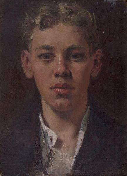 Editor: So, this is Denman Waldo Ross's "Portrait of a Young Man in Black Jacket," a small oil painting at the Harvard Art Museums. The unfinished quality is striking. What strikes you most about this piece? Curator: The incomplete nature of the portrait is precisely where its power resides. It speaks to the fragility of identity, how societal expectations and the weight of history can obscure an individual's true self. Who is this young man beneath the veneer of the black jacket? What constraints are imposed upon him? Editor: Constraints? I hadn't thought of it that way. Curator: Consider the black jacket itself, a symbol of conformity or perhaps even mourning. What social roles were available to young men at the time this was painted, and how might the artist be commenting on those limitations? Editor: I see. So, it's less about the individual and more about the societal pressures they face? Curator: It's both, isn't it? The personal and the political are always intertwined. This portrait, even unfinished, serves as a poignant reminder of the ongoing struggle for self-definition against a backdrop of social forces. Editor: I never would have seen that without your perspective. Thanks! Curator: Art invites dialogue. I'm glad to have shared mine.
