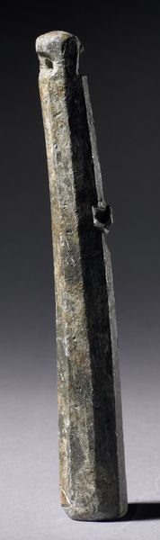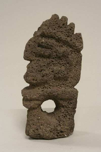 Curator: Looking at this piece by Tsujimura Shiro, from around the 20th century, the “Triangular Vase,” you’re immediately struck by the way he plays with expectation, right? It's this chunky assemblage that questions what a vase even *is*. Editor: It looks less like something made and more like something found. Almost geological, like a chunk of eroded cliff face someone just decided to put on display. It gives off such a primal feeling, like some artifact left behind by a long-gone civilization. Curator: Exactly! He’s known for challenging traditional Japanese ceramic techniques, drawing heavily on Shigaraki ware's earthy aesthetic, in which forms arise from the processes of fire and chance, yet filtered through the abstract and modernist sensibility he would later cultivate. Look how raw the clay body appears. Editor: That heavy texture makes me want to run my hands all over it! You know, pottery's such an ancient human endeavor. And the artist leaves the rough and raw character on this work and he leaves the traces from the raku firing! It’s as if the creator wants to keep it wild. Untamed. Is this supposed to be a flower vase? Because I find it difficult to picture this piece holding cut flowers inside it. Curator: Well, I suppose it could! But it's more of an idea of a vase—a symbolic container. Notice how the title is in parenthesis as well? He’s not interested in function so much as he is in form and the tension between natural processes and human intervention. Editor: And the green coloring on the corner adds a sense of time and nature too. As if nature has worked on this already; has colored it with algae or moss over years. Maybe even centuries. The artist leaves it to chance as well to develop in unpredictable directions? The way light interacts with those crevices and peaks makes for an almost miniature landscape, right? A sense of wonder when encountering something totally unique and unforeseen? Curator: Precisely. So much of Shiro’s work deals with the Wabi-sabi aesthetic and rustic ethos of handmade ceramic traditions, using this sculptural vessel, which defies expectation with its rugged, earthy materiality, for example. A sense of finding beauty in imperfection is always important to keep in mind. Editor: Definitely a captivating piece that really blurs the lines. It really makes one re-consider the role of functional ceramics and its artistic possibilities, too. Curator: A sentiment with which I strongly concur! I suppose our time’s up; I can go around this ceramic block for a full half-hour, easy!