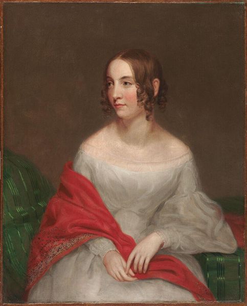 Curator: Okay, let's dive into this portrait of Sarah Cabot Parkman Atkinson by Charles Robert Leslie. Editor: This portrait really captures a sense of reserved elegance. What do you see in it? Curator: Oh, I find myself drawn to the subtle narrative, the story of a woman caught between societal expectations and, perhaps, her own inner world. The way Leslie uses light – almost like a caress – hints at hidden depths. What do you make of that shawl, draped so casually? Editor: I hadn't considered the shawl as part of the narrative. It does add an interesting layer of sophistication. Curator: Exactly! It's all about the details, isn't it? Art becomes a conversation, not just an observation. Editor: This was enlightening! I feel like I understand it on a much deeper level now. Curator: Absolutely! It is now up to us to share this understanding with the world.