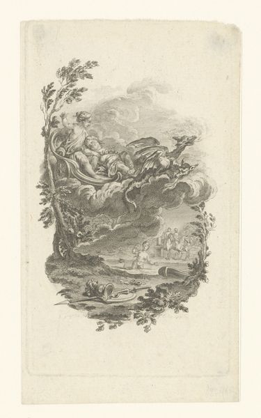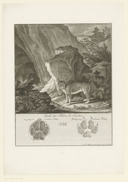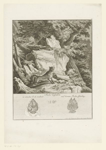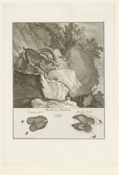 This print, *Wolf met spoor*, was created by Johann Elias Ridinger using etching and engraving. Here, Ridinger skillfully employs traditional printmaking processes to depict a wolf in its natural habitat, alongside detailed studies of its tracks. The stark contrast between light and shadow, achieved through the etching technique, brings a dramatic intensity to the scene, emphasizing the wolf's texture and form. The image's material presentation is critical. Printmaking, as a method of reproduction, democratized access to images and knowledge, yet also speaks to the labor and skill involved in the original production. The contrast between the wild subject matter and the graphic methods used to depict it raises questions about humanity’s relationship with nature, and the role of art in mediating that relationship. By choosing printmaking, Ridinger engaged with broader issues of labor, politics, and consumption, challenging any assumed divisions between art, craft, and wider cultural concerns.