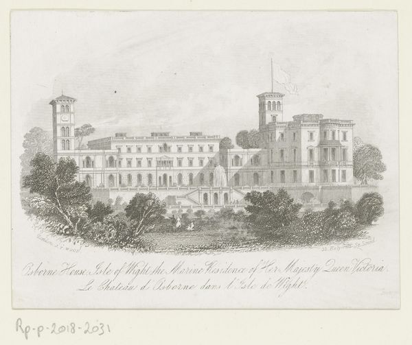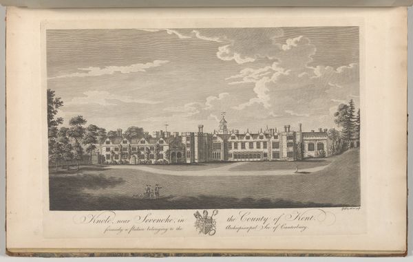 Curator: This print captures Hampton Court Palace, near London, sometime between 1841 and 1885, though its creator remains anonymous. What’s your first take on it? Editor: It feels both grand and oddly delicate, doesn't it? Like a dreamscape version of an imposing palace, all rendered in shades of gray. The figures almost seem to float in the foreground. Curator: Absolutely. Engravings, like this one, held a crucial position in the dissemination of visual information. They shaped the public’s perception, acting as almost a form of visual journalism, wouldn’t you agree? This allowed a wider audience access to famous structures and landmarks. Editor: Definitely. But beyond pure information, it subtly promotes specific social ideals. The palace becomes a stage for portraying fashionable leisure. Observe the attire and social interactions – it reinforces an image of refinement and status, very performative, isn’t it? Curator: The symbolic weight is significant, echoing earlier depictions of idealized courtly life. You see baroque influences mingling with neoclassical architectural styles – all projecting a vision of power anchored in tradition. Do the costumes speak to you of any symbolism? Editor: Well, look at the women's dresses. They’re not just fashionable; they convey status, domesticity, and a certain moral standing. The children at play suggest innocence and continuity. It’s all carefully staged to communicate distinct cultural values. Even the framing of the building implies solidity and endurance. Curator: And how do you see this piece fitting within art of its time? Is it unique, or part of a tradition? Editor: I think it serves as a potent artifact illustrating the politics of image-making. This piece highlights what parts of the historical narrative got emphasis and which parts got less notice in those times, which affects how it is perceived still. Curator: It also invites us to consider its audience: who were these images made for, and how did they shape their understanding of British identity and power? A humble engraving with a heavy past to analyze. Editor: Absolutely. It reveals a desire for not just visibility but a kind of curated, approved, public facing visibility—not merely an image but a constructed vision that still shapes perspectives today.