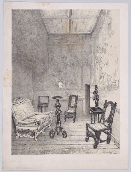 Curator: Samuel Dukinfield Swarbreck created this pencil drawing and print in 1837, titled "Closet of Mary, Queen of Scots, Holyrood Palace, from which Rizzio was dragged and murdered." It’s quite evocative, don't you think? Editor: The stark greyscale palette immediately sets a somber tone, and the perspective pulls you right into that rather confined space. It’s unsettling. Curator: Precisely. The artwork depicts the infamous scene where David Rizzio, Mary’s private secretary, was brutally murdered in front of her. Consider the power dynamics: Mary, a woman ruling in a patriarchal society, her close relationship with Rizzio fueling jealousy and suspicion. The print highlights the vulnerability she faced. Editor: Structurally, the eye is led down the hallway towards that distant doorway, a visual pathway to the exterior and an escape. The sharp contrast between light and shadow exaggerates the claustrophobia of the 'closet,' a small space with very high walls. Note how the furniture in the foreground crowds and constrains the composition, creating a powerful sense of entrapment. Curator: Indeed. Swarbreck used the setting itself to underscore Mary's precarious position and the violence perpetrated against marginalized individuals. The very absence of figures speaks volumes. The tattered state of the room reflects the decay of power and the crumbling of societal norms surrounding gender and authority. The portrait of the man over the mantle—probably Darnley, her jealous husband— looms, too, and reminds us of the social codes and tensions surrounding power. Editor: And what about those ghostly items of apparel arrayed on the table—gloves and a draped mantle—almost as if someone shed their corporeal presence, left as an ephemeral reminder of this ghastly crime? They are almost strategically positioned as compositional guideposts to punctuate the pictorial plane. Curator: An excellent point. Think about how the space, the room, becomes a stage for historical reenactment and the power of place in shaping our understanding of political turmoil. The materiality of the palace is no different than any socialized landscape, it becomes charged through human intervention. Editor: Ultimately, the linear composition serves to deepen the visual symbolism of this intimate and tragic space, the architecture is inextricably linked to a profound historical narrative, one of both intimate betrayal and immense national consequence. Curator: Absolutely, and the work prompts us to question whose narratives are told and how artistic representations contribute to collective memory and shape public sentiment across generations. Editor: I am now struck with a renewed awe for how visual expression can distill space, time and history, and present it to our present-day awareness.
