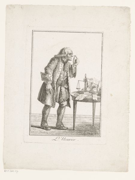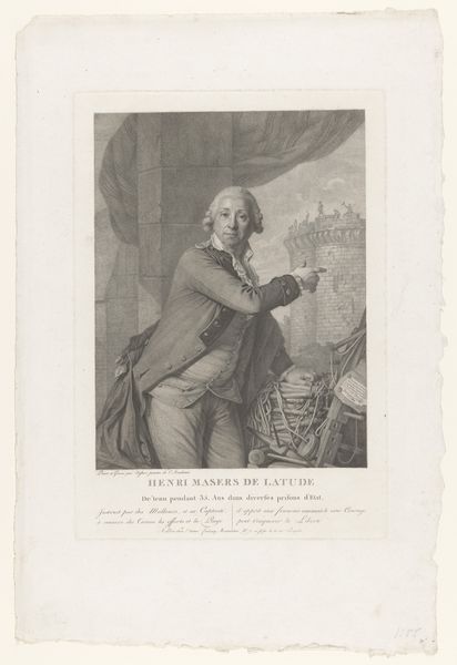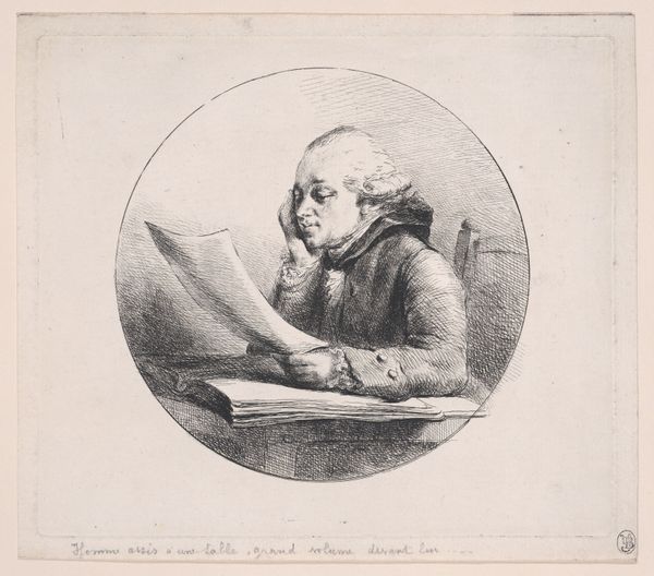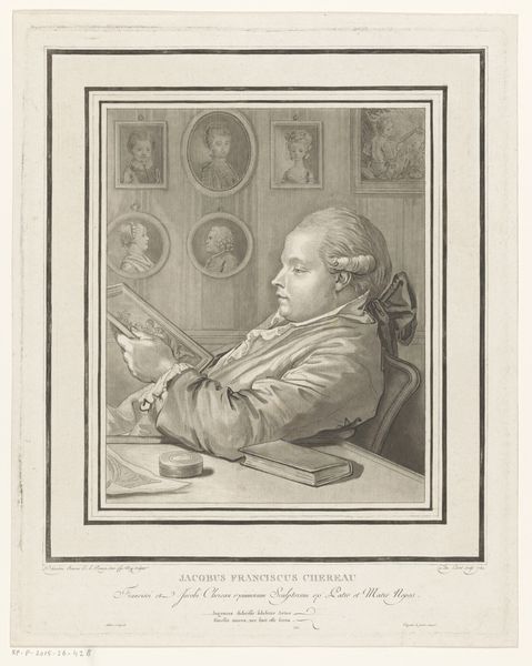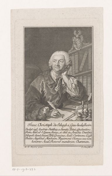 Curator: Good morning. We are looking at an engraving from 1781 by Justus Chevillet, titled “Portret van Peter III van Portugal in zijn studiekamer” which translates to “Portrait of Peter III of Portugal in his study.” Editor: The first impression I have is one of melancholic intellectualism. There's a deep sense of thoughtfulness etched on his face, emphasized by his pose, with his head resting on his hand. He appears caught in contemplation. Curator: Indeed. This work provides a fascinating glimpse into the self-representation of a European monarch during the late 18th century, shaped by emerging trends of the Enlightenment. Observe the presence of both Baroque and Neoclassical styles, which mirror cultural and political trends in that era. Editor: Symbolically, the statue of Minerva, the Roman goddess of wisdom, next to him and the open books speak volumes about Peter III’s desired image: a learned ruler, influenced by reason. But look closely—behind him, almost like a backdrop, are faint depictions of pyramids. A curiosity perhaps, maybe implying exotic learning or ancient mysteries inspiring him. Curator: Exactly. The inclusion of the pyramids introduces the broader theme of expanding intellectual horizons that shaped Enlightenment thought. The depiction, likely taken from contemporary travelogues, suggests Portugal’s aspirations and engagements with global exploration and the era’s fascination with antiquity. Editor: I am struck by the phrase inscribed below the image, "Qui mores hominum multorum vidit et urbes” It suggests that Peter III identified with or wished to align himself with ideals of humanism, indicating a desire to portray his rule through the lens of wisdom and cultural appreciation, as if aligning himself with classical traditions of leadership. Curator: Absolutely. He wanted to be seen as a modern, learned monarch in touch with philosophical and cultural currents. The public display of learning and cultivation was important to political legitimacy during the late 18th Century, influencing public perception of leadership during a tumultuous period. Editor: This portrait presents such an interesting tableau of the man and the era, a mix of aspiration and symbolic pronouncements carefully arranged. Curator: Indeed, it offers rich insight into the political staging and self-construction during a transformational period of European history.