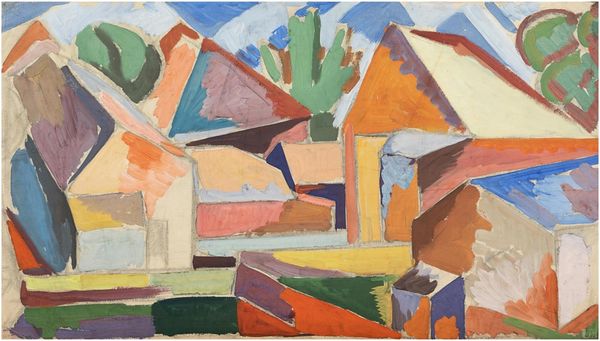 Editor: Here we have Karl Wiener's "Ohne Titel" from around 1932, an oil painting with strong modernist leanings. I'm really struck by the contrast between the industrial, almost oppressive architecture, and the softness of the sky. What do you see in this piece? Curator: I see a visual commentary on the rapidly changing urban landscape of the early 20th century, a time of immense social and political upheaval. Look at how the stark, geometric forms of the buildings dominate the composition, almost dwarfing the natural world, represented by that cloud. Consider the potential impact of industrialization on marginalized communities, both environmentally and socially. Do you think the artist is making a statement about progress versus nature? Editor: I hadn't thought of it that way. I was mainly focused on the formal aspects – the colors, the shapes – but placing it in the context of that time period makes me see it differently. Is it fair to assume the dark blocks could also signify societal structures? Curator: Absolutely. The imposing structures could represent the rigidity of societal norms and power structures, particularly the ways in which those structures confine and shape individual experience. This invites us to consider whose perspectives are centered in the narrative of urban development, and whose are marginalized. Also, this lack of a title really reinforces the fact that the message can be anything the observer takes it to be. Editor: It’s amazing how much depth there is once you start looking beyond the surface. I originally saw it as just a cityscape but now I understand it's so much more nuanced than that. Thank you for your time and detailed explanations. Curator: It's a pleasure to connect art and the relevant conversations of today; the piece encourages us to constantly question and to be observant to changes in urban environments, and for whom those changes are being made.