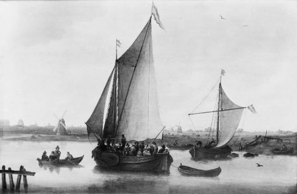 Curator: Ah, here we are in front of "Morning," a serene seascape rendered in oil on canvas by Ludolf Bakhuizen, sometime between 1646 and 1708. Editor: Immediately, it strikes me as almost monochromatic. Shades of gray dance with subtle hints of dawn. It feels…liminal, that point just before the day truly awakens. Curator: Bakhuizen was a master of Dutch Golden Age painting, known for his remarkable ability to capture the drama and poetry of the sea. Think about the merchant fleet as symbols of Dutch pride, or as a mirror reflecting something elemental in us… Editor: Definitely the mercantile aspect stands out; however, the overall composition speaks of transition. It feels significant that the city in the background appears more implied than real. Bakhuizen uses a clever iconography to represent commerce as something secondary. Curator: Fascinating! I agree, but it could also signal a very knowing approach on the artist's part. By softening the details of the background metropolis he directs our attention to the main subject—an embrace of sea navigation and appreciation for the landscape in its purest essence. Editor: Look at the placement and significance of that prominent boat at the center: its large white sail seems illuminated, but also symbolic; a sort of angel wing over the city… or perhaps the soul of the vessel navigating through life? Curator: You're diving deep! Though I tend to think more in terms of skillful draftsmanship when appreciating Dutch art of the period, I’ll concede that every detail serves some emotional or expressive purpose here. And I like what you're saying—it’s more than just water and sky; it carries the weight of a cultural narrative. Editor: In our culture of digital overstimulation, "Morning" offers a respite. Its restrained palette encourages introspection and symbolizes nature's calming persistence. Curator: Indeed. As a whole, the scene represents a nation’s reach… but more fundamentally, a meditation on time and timelessness, light and shadow, impermanence and a promise of new beginnings.